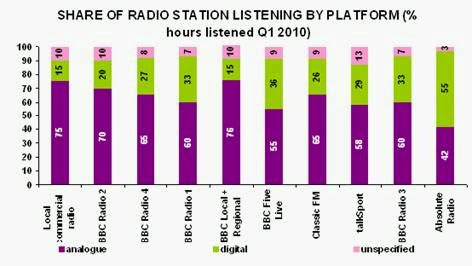 This statement is not merely an exaggeration, it is wholly untrue. The radio industry’s audience data (produced by RAJAR, published by Ofcom for Q1 2010) show that 27% of listening to Radio 4 is via all digital platforms, which include digital television, the internet … and DAB. See graph below.