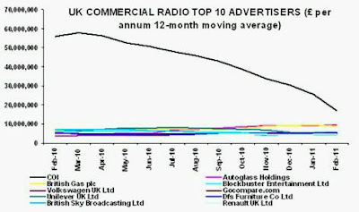 The graph shows clearly that no individual or group of advertisers have been able to substitute entirely for the losses caused by government cutbacks, although some gains were made from clients in 2010 [see blog]. No commercial advertiser spends more than £10m per annum on radio, whereas the COI had spent £58m in the year to March 2010 (but was down to £17m by February 2011). This is simply too big a gap to be filled by a few individual commercial advertisers.