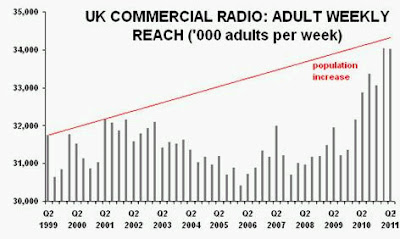 In absolute terms, commercial radio’s adult weekly reach has almost caught up with the UK population growth experienced since 1999, rising to 34m in Q2 2011, marginally below its all-time high the previous quarter.