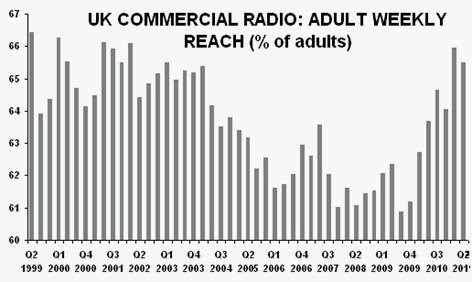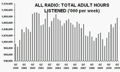 During the last two quarters, commercial radio’s adult weekly reach has jumped above the 65% threshold (65.5% in Q2 2011) that had not been breached since 2003.