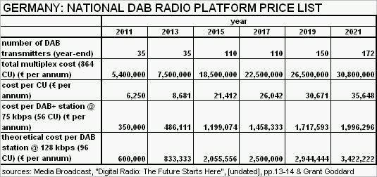 In Germany, the transmission provider, Media Broadcast, has published a price list for commercial stations interested in broadcasting on its planned DAB platform. It anticipates that German stations will use the more spectrum efficient DAB+ system, whereas the UK is wedded to the older DAB system. The prices quoted below (in Euros) require a radio station to take a minimum 10-year contract and are based on two multiplexes operating at each transmitter location (if that were not to happen, the costs would be higher).