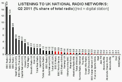 At present, this status quo (using RAJAR’s anachronistic definition of ‘radio’ as purely live and broadcast) suits both parties. The BBC does not wish to be seen to be even more dominant than it already is (54.0% of radio listening in Q2 2011). Commercial radio does not wish to be seen to be weaker than it already is (43.7%) in comparison to the BBC.